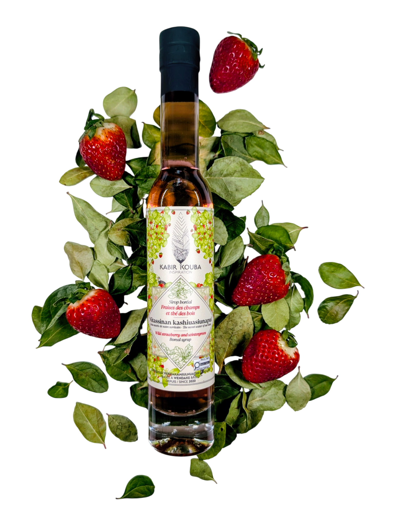 Le Sirop Boréal – Fraise & Thé des Bois capture la fraîcheur éclatante de la fraise et la profondeur mentholée du thé des bois.